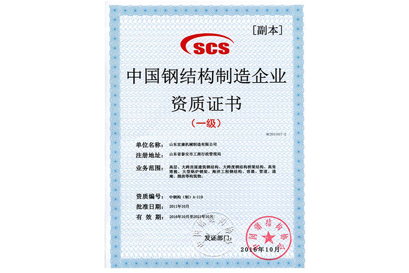 中國鋼結構制造企業(yè)資質(zhì)證書(一級)