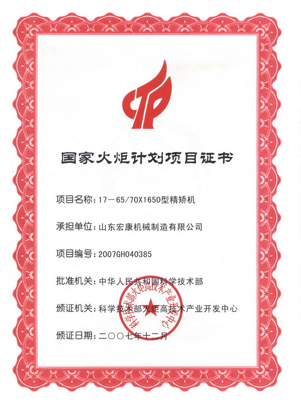 國家火炬計(jì)劃項(xiàng)目驗(yàn)收證書