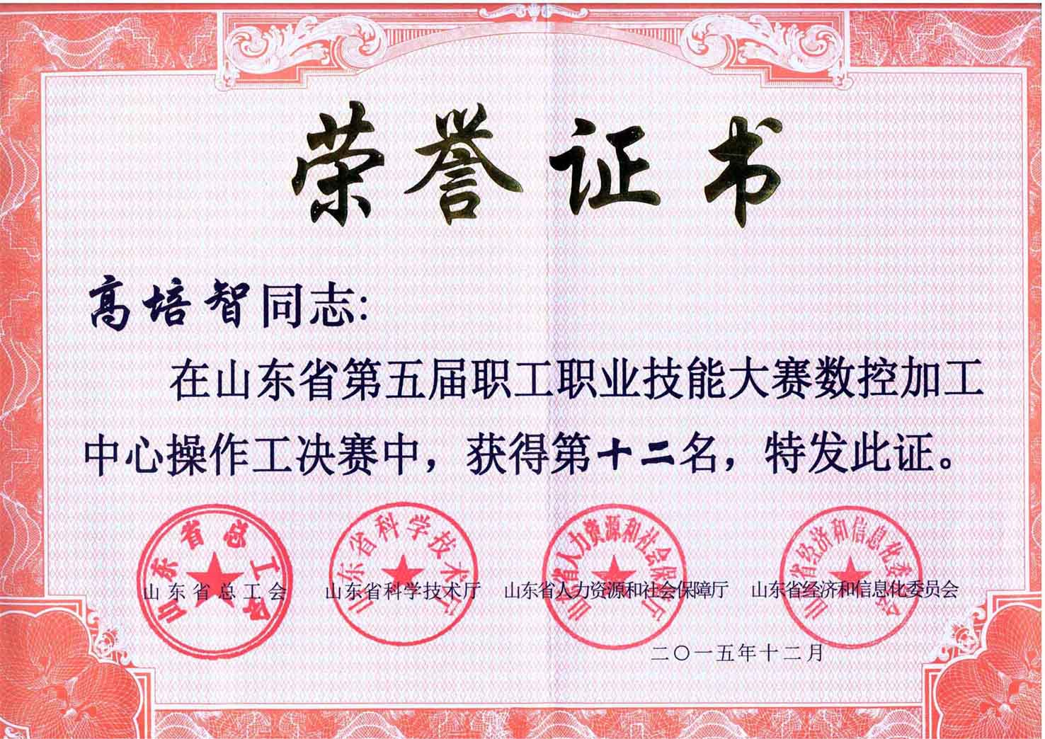 公司員工高培智在山東省第五屆職工職業(yè)技能大賽數(shù)控加工中心操作工決賽中,獲得第十二名,日前受到省總工會、省科技廳、省人力資源和社會保障廳和省經信委四部門聯(lián)合表彰。